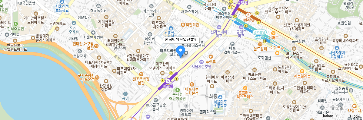 5호선 마포역 2번 출구 50m 직진(1층에 기아자동차 대리점이 있는 성우빌딩 13층)